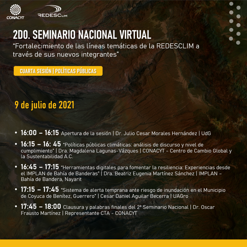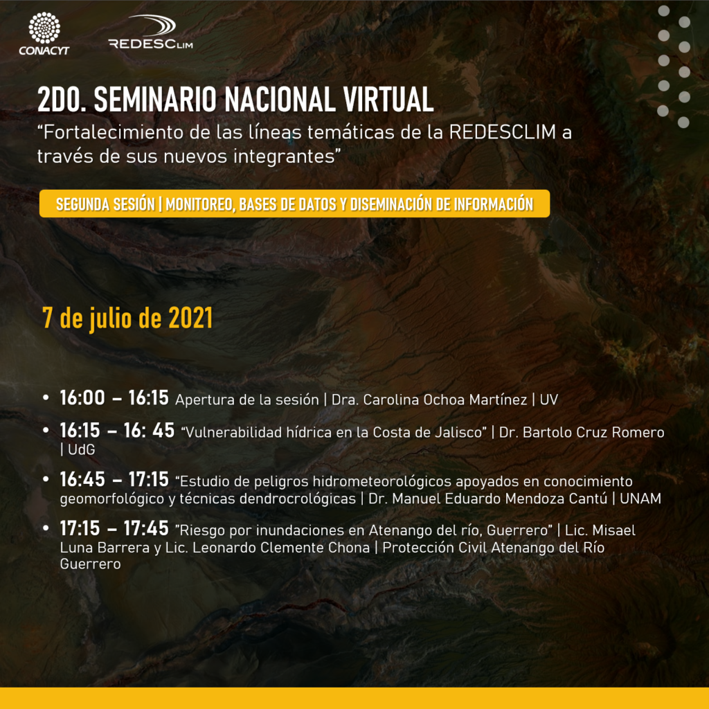 Puerto Vallarta, Jal.- Con el propósito de conocer las áreas de acción de los nuevos integrantes de la Red de Desastres Climáticos Hidrometeorológico, (REDESCLIM), con las temáticas de atención a los desastres provocados por fenómenos hidrometeorológicos y climáticos en México y Latinoamérica, dio inicio el Segundo Seminario Nacional Virtual.