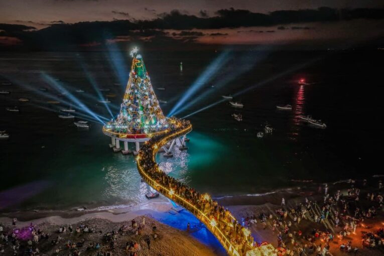 Puerto Vallarta, Jal.- La Navidad se hizo presente en el Muelle de Los Muertos con el arranque del festival “Mar de Regalos”, donde cientos de locales y turistas se reunieron para disfrutar del encendido del árbol navideño en uno de los espacios más representativos de Puerto Vallarta. El festival se desarrollará hasta el primero de enero, con actividades para vivir las festividades frente al mar.