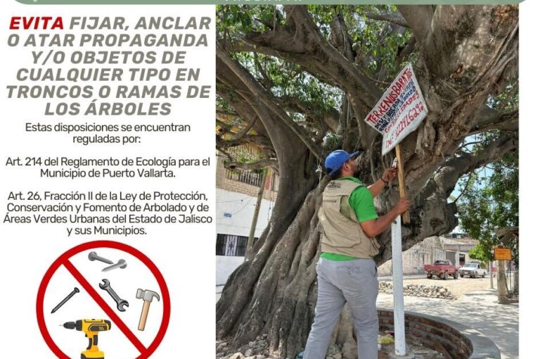 Puerto Vallarta, Jal.- En Puerto Vallarta, la protección del patrimonio natural y la imagen urbana es una prioridad, por lo que la Dirección de Sostenibilidad Ambiental del Gobierno de Luis Munguía ha lanzado una campaña para retirar la publicidad clavada, anclada, fijada o bien atada en árboles de la ciudad. Esta iniciativa se lleva a cabo en cumplimiento de las normativas vigentes, específicamente el Reglamento de Ecología para el Municipio de Puerto Vallarta y la Ley de Protección, Conservación y Fomento de Arbolado y de Áreas Verdes Urbanas del Estado de Jalisco y sus Municipios.