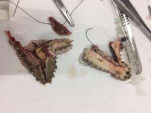 La mañana de este miércoles 2 de agosto, la patrulla verde atendió el reporte de un reptil gravemente lesionado en colonia La Floresta, encontrando al espécimen de Crocodylus acutus con la mandíbula destrozada y sumamente asustado, por lo que fue trasladado a la Subdirección de Ecología para su inmediata atención e intervención quirúrgica.