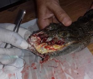 Al respecto, el coordinador en Jalisco del proyecto nacional S.O.S. Cocodrilo y subjefe del Centro de Control, Asistencia Animal y Albergue Municipal (CCAAAM), Armando Rubio Delgado, señaló que en base a un análisis preliminar, se pudo constatar que las afectaciones fueron provocadas por la mano humana, dejando a este joven cocodrilo macho (marcado con el número 316, de 88 cm. de longitud y mil 500 gramos de peso) en total indefensión e incluso implicando su supervivencia, dado que no podrá alimentarse por sí mismo y ello impedirá su reinserción al hábitat natural.