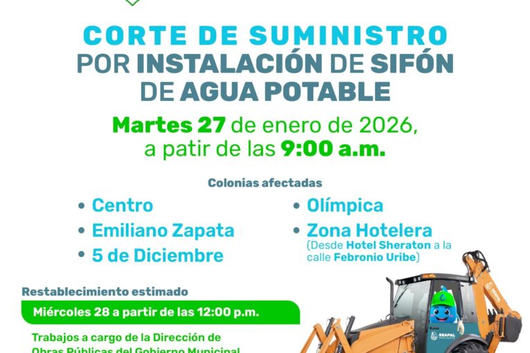 Derivado de estas labores, será necesario suspender temporalmente el suministro de agua potable a partir de las 9:00 de la mañana de este martes 27 de enero y hasta las 12:00 del mediodía del miércoles 28, en las colonias Emiliano Zapata, Centro, 5 de Diciembre, Olímpica, así como el tramo que va del Hotel Sheraton hasta la calle Febronio Uribe, en la zona hotelera.